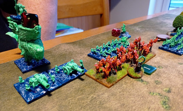 On my right, the ghost whale slunk out of the woods to charge the vampiric knights in the flank; the whale looks side on, but that is just a pragmatic measure to allow the mini to fit. This was the point of (perhaps) my greatest error for the match; the countess commanding the knights had the Titanic Diadem of Foresight which would have allowed her to pre-empt the flank charge, but I plumb forgot about it!