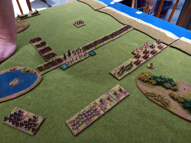 Wanting to do something a bit different, we decided to play in a wooded area and Andrew helpfully chose an impassable water feature which was placed on my side of the table. After the re-jigging of terrain, it ended up in the centre of the battlefield resulting in a less than customary deployment. In the top corner, Lucullus' elite legions have formed a straight line across from the coastal zone. The regular legions are in column, effectively forming a box around his camp. The Numidians are sitting out on their own on the far side of the deployment area.