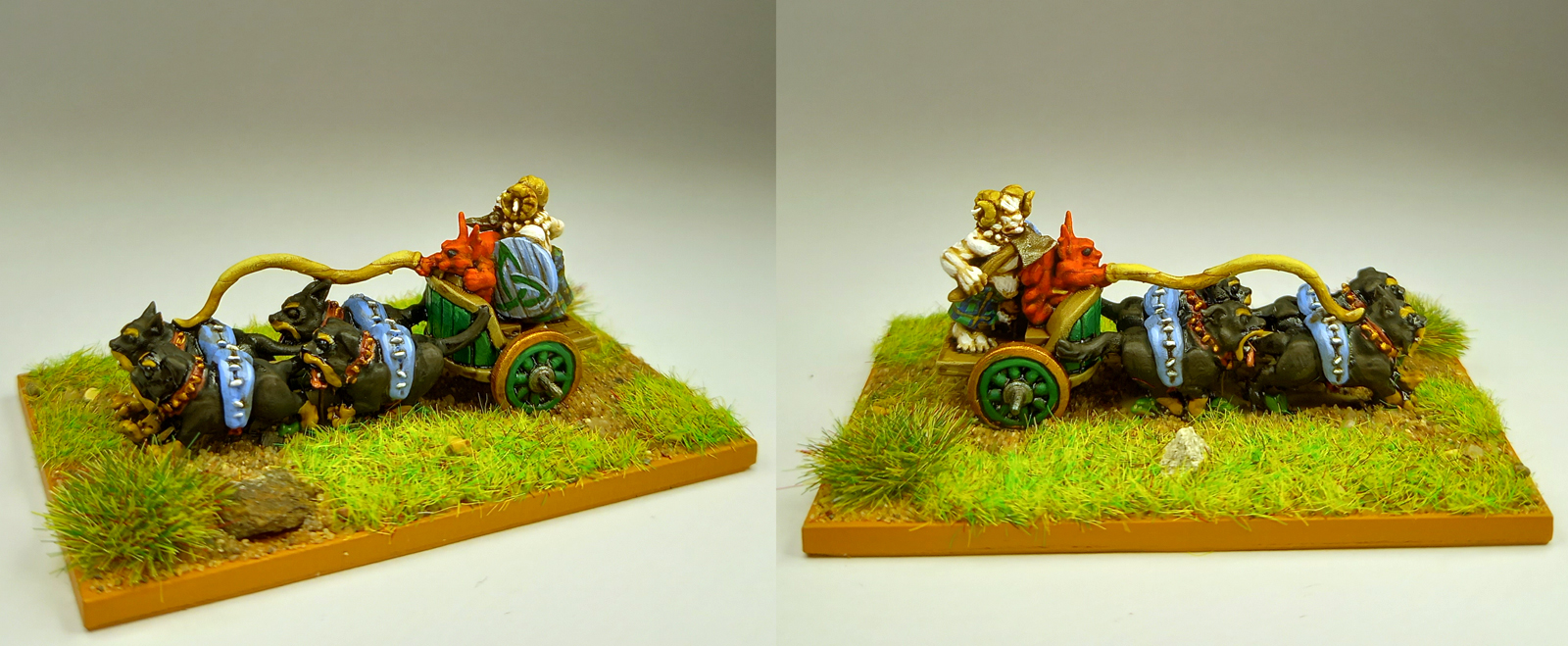 The most heroic of the thegns (big-beastfolk-warrior-chaps) is a goat with a mouse charioteer. I gave all the thegns the same Antrim-inspire tartan I am using across the army.
